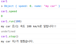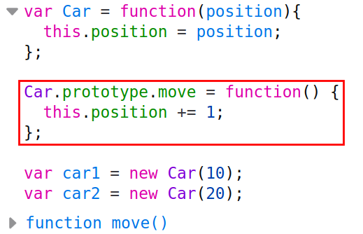 객체 Car 의 prototype 이라는 객체 안에 move 메소드를 추가하여 사용할 수 있게 만든다.